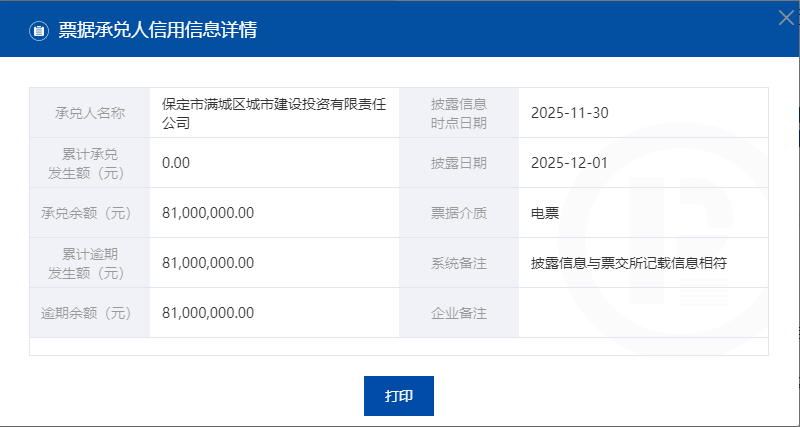 据上海票据交易所票据信息披露平台,保定市满城区城市建设投资有限责任公司(简称“保定满城城建”)票据违约。