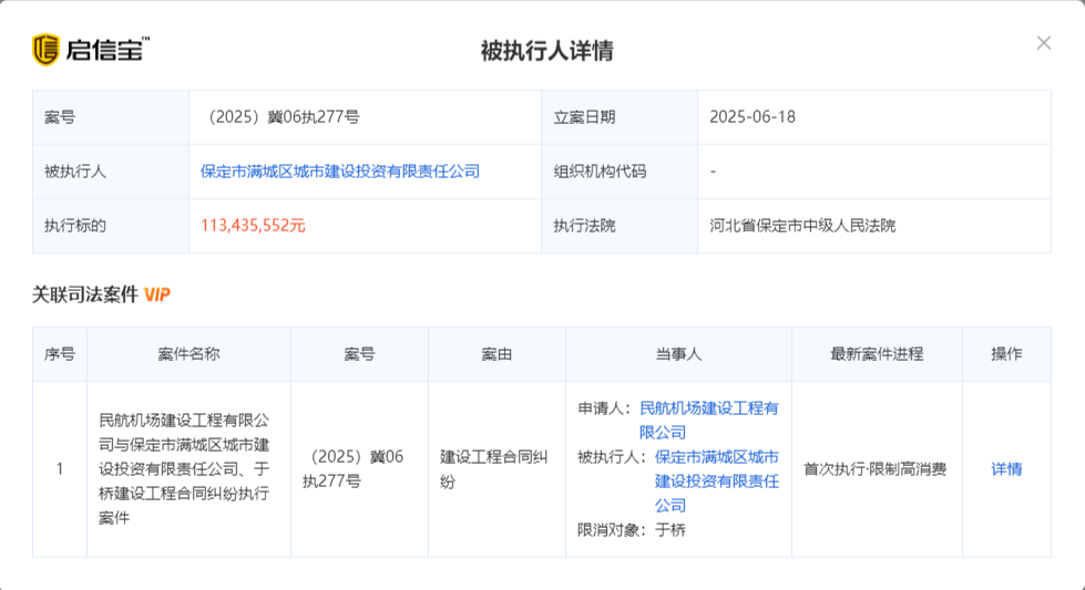 除了票据逾期,公司还深陷法律纠纷,面临显著的资产损失风险。据启信宝,2025年6月份炒股配资官方网,保定满城城建因建设工程合同纠纷被保定市中级人民法院执行1.13亿元。